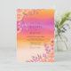 This design showcases a vibrant watercolor gradient transitioning from warm orange to deep magenta. Delicate peach roses and pink daisies are paired with purple eucalyptus leaves in a graceful arrangement. The bold ombre background creates a romantic atmosphere reminiscent of a tropical summer sunset.