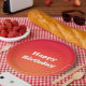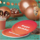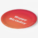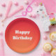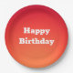 Hellrote Orangenpapier-Teller, Happy-Geburtstags-Thementext kann für jede besondere Veranstaltung personalisiert werden.