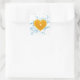 Herzförmige Scheibe orangefarbener Früchte mit Wasserspritzen auf weißem Hintergrund.