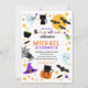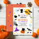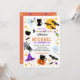 Feiern Sie Ihren beängstigenden Geburtstag mit dieser weißen und orangefarbenen, spektakulären Halloween-Einladung. Dieses Design bietet eine Vielzahl von Halloween-Figuren und Bonbons auf einem weißen Hintergrund auf der Vorderseite, Halloween-Bonbons und Sterne auf einem orangen Hintergrund auf der Rückseite.