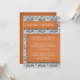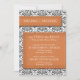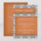 Moderne Einladungen für Ihre Hochzeit. Enthält ein orangegestepptes Design/Illustration über ein schwarz-weißes Damast-Muster. Zusätzliche Informationen, Anweisungen oder Details können auf der Rückseite gedruckt werden (optional).