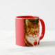 Striped cat on mug with red trim. Art by Patricia Villa.