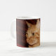 Nah-oben Profil Kopf der goldgelb orange gestreifte Tabby Katze. Kurz-haariges Kätzchen mit einem auffälligen Blick in den bernsteinfarbenen grünen Augen. Das Kätzchen hat eine niedliche kleine rosa Nase und lange Whiskers. Die Katze sitzt auf einem dunkelrostigen Sofa, das dem Foto einen eleganten, schönen Hintergrund verleiht. Passen Sie es mit Text weiter an, um ein perfektes Geschenk zu machen, besonders für jemanden in der Heimtierpflege- oder Veterinärbranche. Katzengesicht