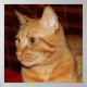 Nah-oben Profil Kopf der goldgelb orange gestreifte Tabby Katze. Kurz-haariges Kätzchen mit einem auffälligen Blick in den bernsteinfarbenen grünen Augen. Das Kätzchen hat eine niedliche kleine rosa Nase und lange Whiskers. Die Katze sitzt auf einem dunkelrostigen Sofa, das dem Foto einen eleganten, schönen Hintergrund verleiht. Passen Sie es mit Text weiter an, um ein perfektes Geschenk zu machen, besonders für jemanden in der Heimtierpflege- oder Veterinärbranche. Katzengesicht