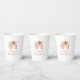 These adorable baby shower paper cups feature trendy boho style and trendy handwritten script. A terracotta and neutral cute painted rainbow is decorated with orange and peach watercolor flowers on a simple white background.