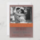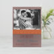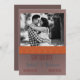 Nichts sagt Herbst wie verbrannte Orange und Braun. Diese Farben sind ein perfektes Paar für eine Hochzeit im Herbst. Die Save the Date flache Karte ist so konzipiert, dass sie ein Foto des glücklichen Ehepaares enthält, das durch ein braunes Overlay gerahmt ist. Der braune Rahmen hat eine graue Textur. Ein verbranntes orangefarbenes Band trennt das Bild oben von den Details unten. Das Band enthält ein Muster aus roten, salzigen und blauen Linien, die sich kreuzen.