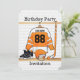 Jersey Hockey des orange, weißen und schwarzen Eises, der in einem ändernden Raum mit einem Hockeystock, -sturzhelm und -hockey hängt, gefrieren Skate. Der Sport Jersey ist mit Ihrem eigenen Namen und Zahl völlig kundengerecht. auf der Änderung der Rückseite gerade führt die Details an Ihrem eigenen Party einzeln auf, um einzigartige Fußballgeburtstags-Party Einladungen zu schaffen. Große Geburtstagseinladung für irgendeinen Hockeyspieler, Eis-Hockeymamma oder Fan.