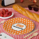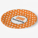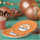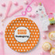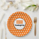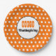 Fun Erntedank Papier Teller mit großen weißen Kreis und "Happy" (weißer Text in orangefarbenen Rahmen) und Erntedank in klassischem Schriftart auf einer Seite.