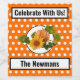 Maßgeschneiderte Weinflaschen für den Erntedank. Orangefarbener und weißer Polka-Punkt-Hintergrund mit einer schönen Sonnenblume und Kürbisbild, die aus einem großen weißen Kreis ausstrahlen. Sie können die Nachricht von "Feiern Sie mit uns" auf alles ändern, was Sie sich aussuchen. Und natürlich können Sie den Namen ganz unten von "The Newsmans" zu jeder anderen Person oder Person anpassen - wie Von Ihren Bestie, Von der Mama, etc.