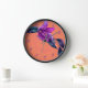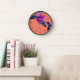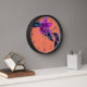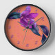 Orangefarbene Wanduhr mit schwarzem Rahmen und lila Orchidee. Dank
