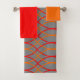 Dieses Set ist mit einem orangefarbenen Waschlappen, einem roten Handtuch und einem Badehandtuch mit orangefarbenen und roten Wellen im Boho-Design ausgestattet.