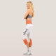 Die modernen Leggings in Weiß und Orange sind mit einem eleganten Blumendesign auf dem Bund und den Beinen mit weißen Streifen versehen. Einfach anpassbar, indem Sie auf beiden Seiten Ihren Namen auf einem kalligraphischen schwarzen Schriftart hinzufügen.