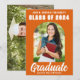 Diese moderne, in Orange und Weiß gehaltene Ankündigung eines Senior Foto Graduate weist Ihren High School- oder Uni-Namen für die Klasse von 2024 auf. Passen Sie mit Ihrem Namen unter dem schicken, fett handgeschriebenen Skript für eine großartige personalisierte Abschluss-Karte an. Fügen Sie ein 2. volles Foto auf der Rückseite hinzu.