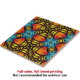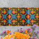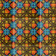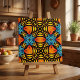 Diese Keramik weist ein schönes Muster auf, das das Auge in einen Farbtanz und eine Form zeichne. Das komplexe Design zeichnet sich durch symmetrische Arrangements lebendiger Farbtöne aus, die einen optischen Täuschungseffekt erzeugen. Die feurigen orangefarbenen Formen, die den Augen oder Blätter ähneln, stehen im Mittelpunkt und strahlen ein Gefühl von Wärme und Energie aus. Diese werden durch strahlende gelbe Linien verstärkt, die Kontrast hinzufügen und die Geometrie des Designs hervorheben. Coole blaue Farbtöne verleihen der Kachel Tiefe und wirken wie blühende Blume oder Sterne inmitten der Lebendigkeit. Diese Elemente werden durch schwarze, tiefschwarze Linien umrissen und definiert, die visuelle Struktur hinzufügen und den Gesamteffekt verstärken.