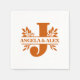 Passen Sie die Größe des Schriftartes bzw. den Abstand der Buchstaben an, um die Namen oder den Nachnamen des Paares einzutragen. Ein fett gedruckter Brief floral Blätter aufgeteilt Monogramm J mit Namen der Braut und Bräutigam in der Koordinierung fett Schriftart Stil. Initial J und alle Kaps Text auf Servietten für Ihre Herbsthochzeit. Passen Sie die dunkelbraune Orangenfarbe an, um Ihre eigenen personalisierten mit Monogramm Servietten zu erstellen. Weitere Optionen finden Sie in der Kategorie Monogramme nach Buchstaben. Erhöhen Sie die Größe Ihres Nachnamens nach Bedarf. Eine Herbstfarbe auf ecru Servietten.