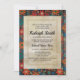 Niedliche, leicht zu anpassende, DIY-Party/Off-Uni-Party Einladung mit orangefarbenen, roten und blauen Blumen auf dunkelfarbenem rustikalem Holzboden.