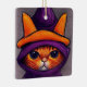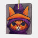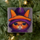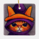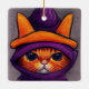 Orangefarbene Katze mit Lila Hexenhut Halloween Keramik Ornament. Ein zeichn einer niedlichen orangefarbenen Katze mit einem lila und orangefarbenen Hut.