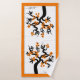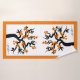 Schwarzer Sakura Kirschbaum mit Liebesvögeln, orangefarbene Blüten und Set mit Ränder-Badehandtuch. Es ist mit einem schwarzen Sakura-Baum mit orangefarbenen Blume mit schwarzen Herzen in der Mitte und einem Paar Liebesvögel ausgestattet. Ihr Name ist in einem Schriftart im Skriptstil geschrieben.