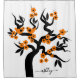 Orangefarbene und schwarze Liebesvögel Sakura Kirschbaum mit Blütenduschvorhang. Es ist mit einem schwarzen Sakura-Baum mit orangefarbenen Blume mit schwarzen Herzen in der Mitte und einem Paar Liebesvögel ausgestattet. Ihr Name ist in einem Schriftart im Skriptstil geschrieben.