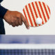 Orangefarbene Polo-Streifen und fest Tischtennis Schläger