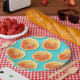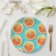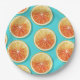 Ein Muster aus frischen und saftig orangefarbenen Scheiben in den Mandarinen Orange und Rot Orange, mit einer Aquarellstruktur, die das Ganze frisch zuschneidet. Sie sind auf einem hellblauen Hintergrund für einen hellen und sommerlichen Look platziert.