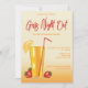 Desteis lustige Cartoon Illustration eines tropischen Orangengetränks mit drei Erdbeeren. Im Glas ist auch ein roter Strohhalm, auf dem eine orangefarbene Zitrusfruchtscheibe angebracht ist. Der Hintergrund ist ein wunderschöner Orangengraben, der dem Design einen tropischen Sonnenuntergang verleiht. Es gibt auch mehrere personalisierbare Textbereiche. Dieses Design eignet sich ideal für Party, die zum Geburtstag feiern oder zum Beispiel für einen Junggeselinnen-Abschied.