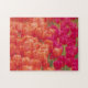 Begrüßen Sie den Frühling mit seinen Blume mit leuchtend orangen und heißen rosa Tulpen.