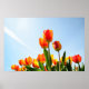 Poster-Druck aus Blume, bestehend aus orangen und roten Tulpen, die aus tiefer Sicht gegen einen blauen Himmel gesehen werden.