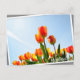 Postkarte mit Blume aus orangefarbenen und roten Tulpen, die aus tiefer Sicht gegen einen blauen Himmel mit weißem Rand und dem Text Holland gesehen werden. Das Bild wird etwas gedreht, um die Illusion zu schaffen, dass es sich locker legt.