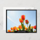Postkarte mit Blume aus orangefarbenen und roten Tulpen, die aus tiefer Sicht gegen einen blauen Himmel mit schwarzem Rand gesehen werden, und in Weiß den Text "Holland".