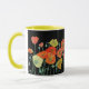 Orangefarbene und schwarze Pflaumen Wasserfarben Tasse. Ein wunderschönes Blumendesign in Aquarelltönen. Entworfen aus meinen ursprünglichen Aquarellbildern, die ich aus meinem eigenen Blumengarten gemalt habe.
