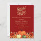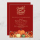 Terrakotta, gebrannter orangefarbener Hintergrund. Die Einrichtung ist mit Kürbissen und orangen und gelben Blumen geschmückt. Personalisieren Sie die Party-Details und fügen Sie sie hinzu. Text-Skript: Dankbar und gesegnet.