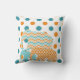 Ein niedliches und farbenfrohe Kissen mit drei Elefanten in Mustern, Zickzack Streifen und diagonalen Streifen in Weiß, Blau und Orange auf weißem, orangefarbenem Polka-Hintergrund.