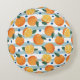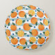 Orangen auf gestreiftem Hintergrund, Sommermuster. Rundes Kissen