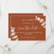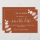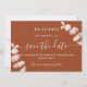 Ein modernes und elegantes Save the Date für eine Hochzeit. Ein verbrannter, orangefarbener Hintergrund mit Eukalyptus-Stiemen, Sprigs. Personalisieren und fügen Sie ein Datum und Namen hinzu. Der Text: Save the Date ist mit einem großen angesagten, handgeschriebenen Stilskript geschrieben.