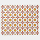 Handtuch-Set mit einem Muster aus orangefarbenen und gelben Sonnenblumen neben roten geometrischen Kreuzen, das an einer Metallstange hängt; passender Waschlappen flach ausgelegt.