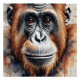 Ein Orangutan mit detaillierter Wasserfarbe mit ausdrucksvollen Augen wird vor einem weichen, verschwommenen Hintergrund dargestellt. Die natürlichen Farben verstärken das lebensechte Aussehen.