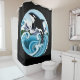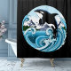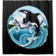 Ein Orca, der aus dem Ozean gesprungen ist, mit Wasser überall. Berge und blauer Himmel rund um den Killerwal gezeichnet alle in einem Art Nouveau Tattoo Stil.