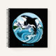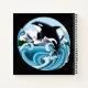 Ein Orca, der aus dem Ozean gesprungen ist, mit Wasser überall. Berge und blauer Himmel rund um den Killerwal gezeichnet in einem Art Nouveau Stil.