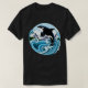Ein Orca, der aus dem Ozean gesprungen ist, mit Wasser überall. Berge und blauer Himmel rund um den Killerwal gezeichnet alle in einem Art Nouveau Tattoo Stil.