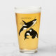 Schaffen Sie ein personalisiertes Geschenk für jemanden, der Wale und andere Meerestiere Lieben. Dieses Pint-Glas zeigt Abbildungen von Orcas oder Killerwalen in Schwarz-Weiß mit Grafiken auf der Vorder- und Rückseite des Glases. Die Vorderseite hat einen Platz, um einen Namen in fett schwarzen Buchstaben hinzuzufügen.