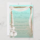 Diese Hochzeitseinladung hat ein romantisches Strandthema. Der Hintergrund weist einen Gefälle auf, der an einen tropischen Ozeanstrand oder eine Insel erinnert. In der Mitte befindet sich ein Boho-Bogen aus Holz und Chiffon. Auf dem links ist ein großer Stamm mit weißen Orchideen im Aquarellstil angebracht.