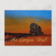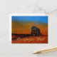Die Oregon Trail Postkarte mit einem alten zertäterten, silbernen, überdachten Wagen, der irgendwo durch raues Gelände reiste. Die Wege, die Hunderttausende von Migranten zu ihrem endgültigen Ziel geführt haben.