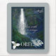 Ein digitales Gemälde eines Wasserfalls, das sich entlang der Multnomah Falls in der Landschaftlichen Umgebung der Columbia River Gorge in Oregon befindet. Die weiße Zahl in der oberen Ecke ist das Jahr, in dem Oregon Staat wurde. Die weiße Schrift im Zentrum des Gemäldes, "Sie fliegt mit ihren eigenen Flügeln", ist das Motto des Staat. Am Ende des Gemäldes befindet sich eine weiße Trillium-Blume neben Oregon in weißer Schrift. Eine einfache, dunkelblaue Grenze schließt das Bild ab. Image Copyright ©2023 Kimberly J Tilley.