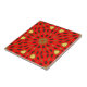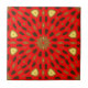 Die Gestaltung der Ziegel ist lebendig, die geometrischen Formen sind in Gelb, Beige und Schwarz auf einem roten Hintergrund im orientalischen Stil gehalten.