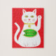 Dieses phantastische Rätsel zeigt ein grafisches Gestaltbild einer glücklich orientalisch-weißen Katzenkatze. Die Katze hat schöne goldene Augen und trägt eine goldene Medaille auf dem Halsband. Die Katze hat rosa Ohren und Flüstern. Dieses niedliche kleine Kätzchen hält einen goldenen Jadestein mit grünem Jade und eine Nachricht in goldenem Text, die "Viel Glück" sagt.