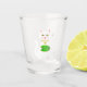 Dieses phantastische Schuss-Glas zeigt ein grafisches Design-Bild einer glücklich orientalisch-weißen Katzenkatze. Die Katze hat schöne goldene Augen und trägt eine goldene Medaille auf dem Halsband. Die Katze hat rosa Ohren und Flüstern. Dieses niedliche kleine Kätzchen hält einen goldenen Jadestein mit grünem Jade und eine Nachricht in goldenem Text, die "Viel Glück" sagt.