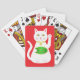 Dieses phantastische Kartenspiel zeichnet sich durch ein grafisches Design einer glücklich orientalisch-weißen schwingenden Katze aus. Die Katze hat schöne goldene Augen und trägt eine goldene Medaille auf dem Halsband. Die Katze hat rosa Ohren und Flüstern. Dieses niedliche kleine Kätzchen hält einen goldenen Jadestein mit grünem Jade und eine Nachricht in goldenem Text, die "Viel Glück" sagt.