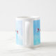 Tasse mit blauem Aquarell und roten Origami-Vögeln. Die Tasse ist zylindrisch mit weißem Griff und weißem Interieur. Der Hintergrund ist eine hellblaue Aquarellwäsche. Im Hintergrund sind sechs rote Origami-Vögel verstreut. Die Tasse ist aus weißem Marmor.