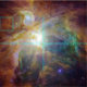 Das Spitzer Weltraumteleskop und der Hubble zeigen den Orions-Nebelfleck in einer Explosion der Infrarot-, ultravioletten und Sichtbarlicht Farben. Im Herzen des Nebelflecks ist ein Set von vier ungeheuer enormen Sternen, zusammen genannt das Trapez. Diese Ungetüme sind ungefähr 100.000mal heller als unser Sun. Ihre Gemeinschaft kann als der gelbe Fleck nahe der Mitte der Zusammensetzung identifiziert werden. Kredit: Die NASA, ESA, T. Megeath (Universität von Toledo) und M. Robberto (STScI)